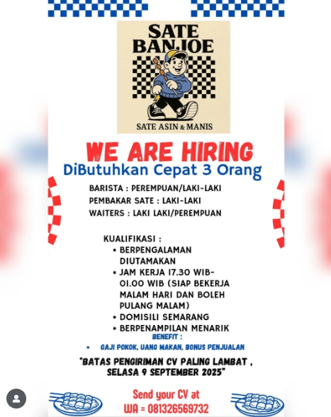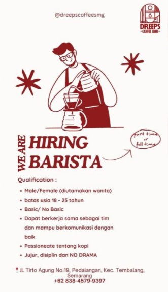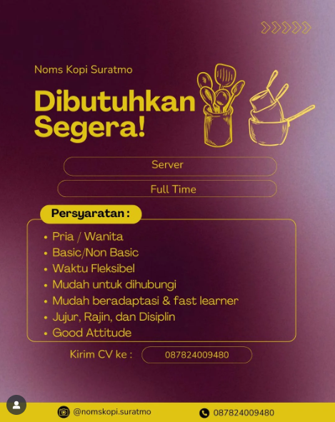 - Ikuti akun Instagram atau Facebook kafe dan restoran di Semarang. Mereka sering mengumumkan lowongan secara langsung di media sosial.